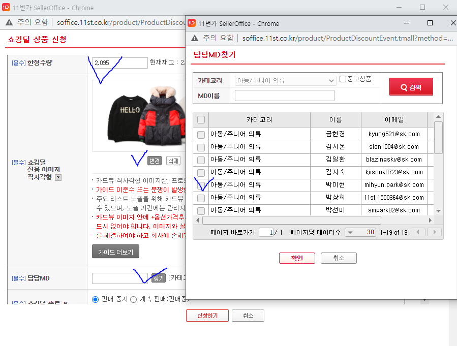 8) 담당 해당 MD명으로 체트하시고 최종 신청이 끝나고 나면 이상유무를 확인하기 위해 해당 MD에게 메일로 승인된 화면을 캡쳐하여 메일로 승인요청을 다시한번 검토 요청하셔야 합니다.