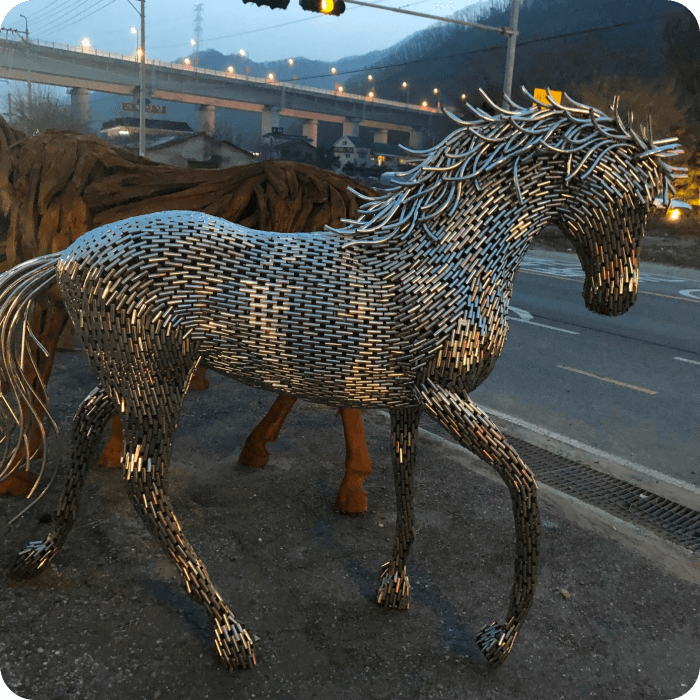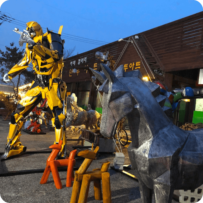 마지막으로 배를 채우고 나니 눈이 즐거운 것이 필요한데요 집으로 오는 길에 우연히 발견한 조각품들이 있는 카페 갤러리 인투아트 이었는데요, 잘 알려져 있지 않은 듯했으나 양수리 쪽 북한강 도로로 가다 보면 금방 알아볼 수 있는 조형상이 있는 곳입니다. 저희는 이미 디저트와 숯불 닭갈비로 배를 채운 상태라 밖에서 사진만 담아서 왔는데 멋있는 하루를 보내고 온 느낌이었습니다