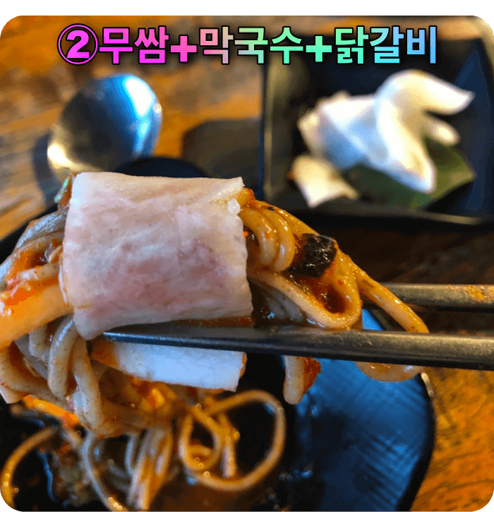 2) 두 번째 방법입니다. 무쌈과 막국수 그리고 닭갈비를 싸어 먹는 방법입니다. 정말 맛있습니다.