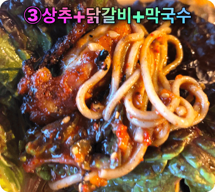 3) 세 번째 방법입니다. 상추와 닭갈비 그리고 막국수를 싸 먹는 방법입니다. 정말 맛있습니다.