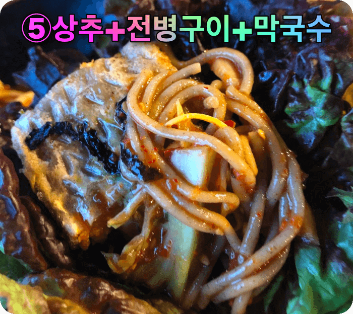 5) 다섯 번째 방법입니다. 상추와 전병 구이 그리고 막국수를 싸 먹는 방법입니다. 맛있습니다.