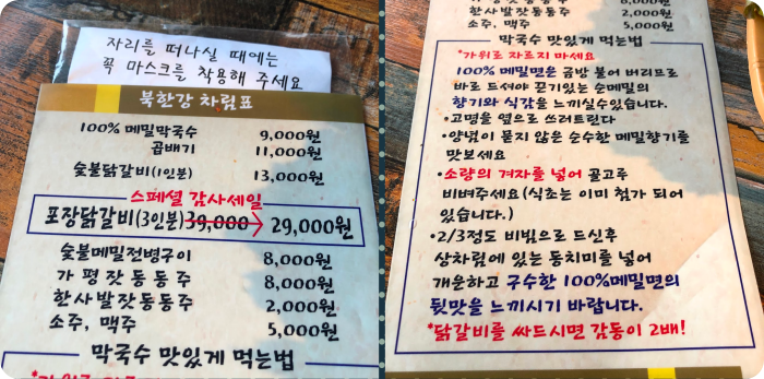 북한강 막국수 숯불 닭갈비 맛집에서 제일 아쉬웠던 점이라면 기다리는 시간이 30~50분 정도인데 기다리는 시간에 고객들을 위해서 커피나 다른 간단한 식음료라도 대접을 했으면 하는 아쉬움이 있었습니다.