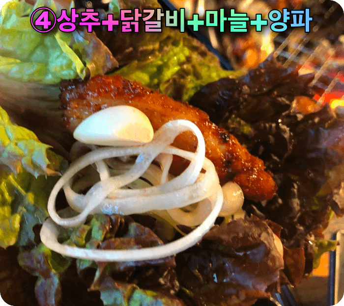 4) 네 번째 방법입니다. 상추와 닭갈비 그리고 마늘과 양파를 싸어 먹는 방법입니다. 맛있습니다.