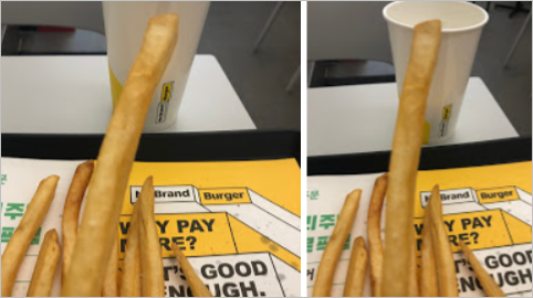 다음은 감자튀김 사진인데요 예술 ^^ 입니다. 프라이 두께가 예전 버거킹 감자튀김이상으로 총 수량을 세어 봤더니 18개 였습니다^^. 쓸데 없이 프라이 수량이나 세고 혼자 빨리 먹고 나가면 좀 그렇고 사진도 찍어야 되고 ㅎㅎ