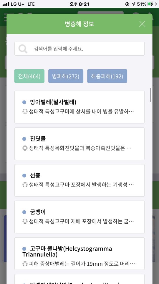 병충해 정보를 또한 같이 확인이 가능합니다.