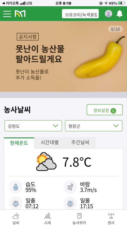 첫째 : 내가 사는 지역 설정하고 날씨 확인이 가능하고 시간대별로 확인이 가능하고 알람 설정하면 출하시점에 맞춰 농작물 출하작업 일정 조율 가능함