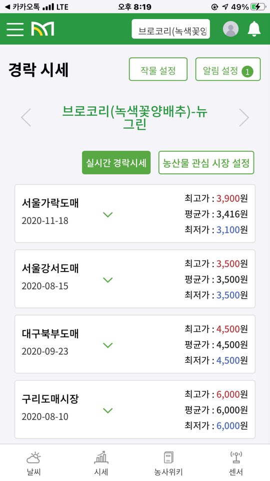 둘째 : 출하할 공판장을 설정하면 지역별 시세 비교 가능한데, 예를 들어 출하단가가 지역별로 다르기 때문에 농작물 공판장 출하지역 조정하여 출하할 경우 수익 관리가 가능한 형태이므로 너무나 좋은 어플입니다.