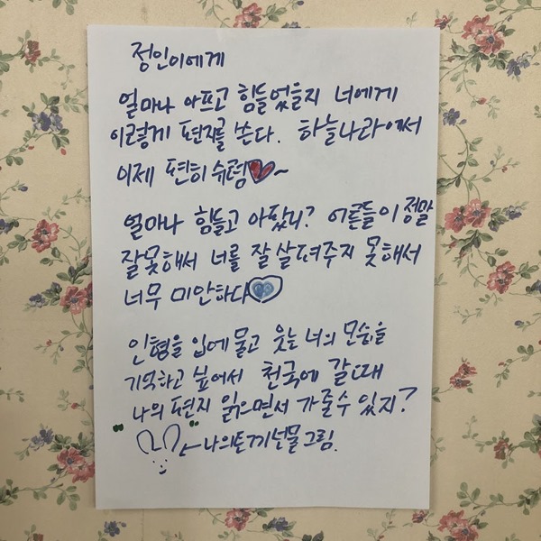 오늘은 정말 안까운 사실은 가족들이 뉴스를 보면서 너무 안타까워 글을 써봅니다. 정인아 오늘은 너의 소식이 널리 알려지면서 새해첫해 부터 너의 이름으로 편지를 써 보게 되는 구나~ 많이 아팠지, 외로웠지? 얼마나 무서웠니? 같이 지켜주지 못한 너의 웃는 모습을 보고 이렇게 글로 너와 친해져 보려고 하는데 괜찮지?