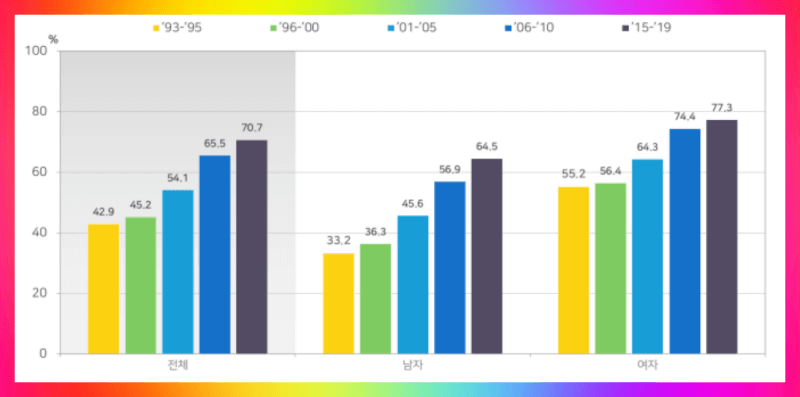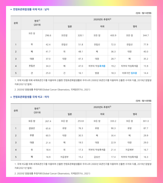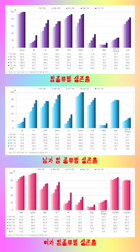 - 위암 43.0% -> 77.5%, 남성 : 44%->78.3%, 여성 : 43.7%->75.8%