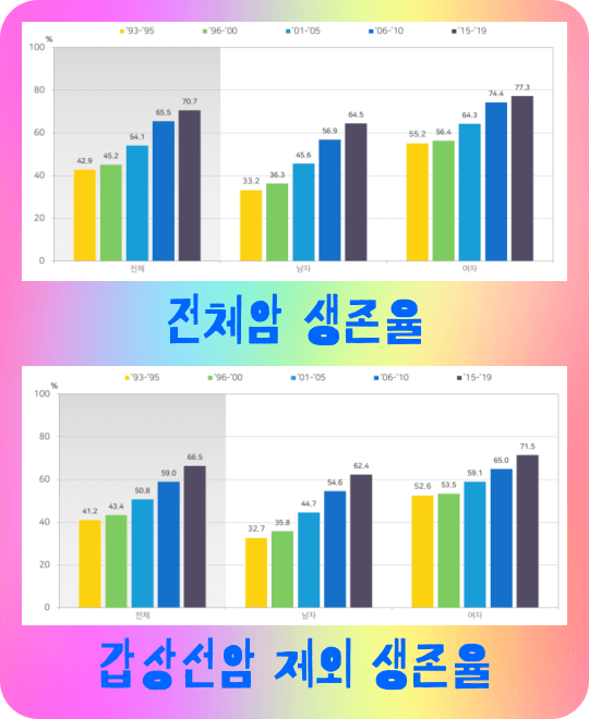 95년까지는 암 생존율이 42.9%가 생존을 했지만 19년 기준으로는 70.7%로 늘어나서 우리나라 의학 발달 수준을 확인을 할 수가 있습니다. 10명 중에서 7명은 생존으로 확률이 엄청나게 좋아졌습니다.