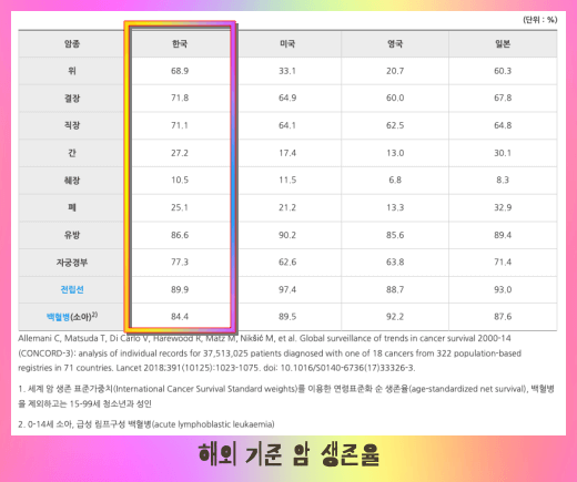 국내 암기준 생존율 보다 높은 생존율을 보유한 국가로는 간암에서 일본이, 전립선암에서 일본, 미국이 높고, 소아 백혈병에서는 미국 영국 일본의 생존율이 높은 것으로 보아 해당 국가 의학 수준이 높을 수도 있겠다는 생각이 듭니다.