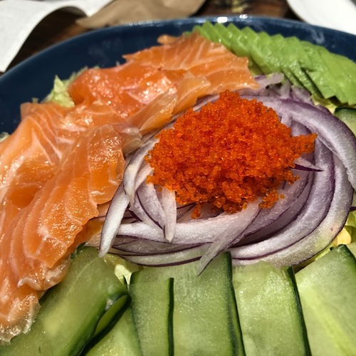 아보카도와 연어알 연어회랑 오리 양파 샐러드가