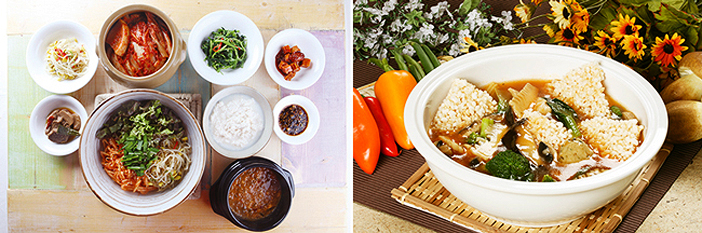 Signature menus:Bulgui ssambap (griddle rice wrapped in greens) 12,000 won / Dugaejang jeongsik (vegan soup meal) 10,000 won / Sundubu gangdoenjang bibimbap (bibimbap with soft tofu soybean paste sauce) 10,000 won