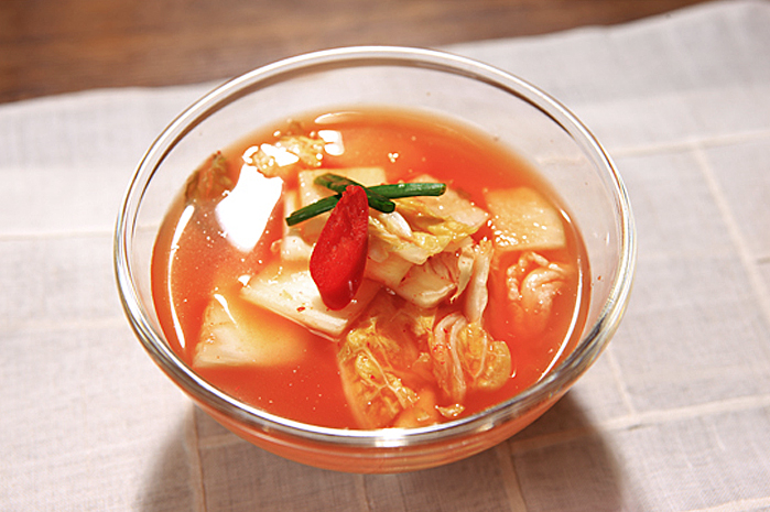 This is a less spicy version of kimchi with both cabbages and radishes. Using a great deal of kimchi stock, it tastes sweeter than other types of kimchi due to the addition of sliced fruits such as apple and pear.