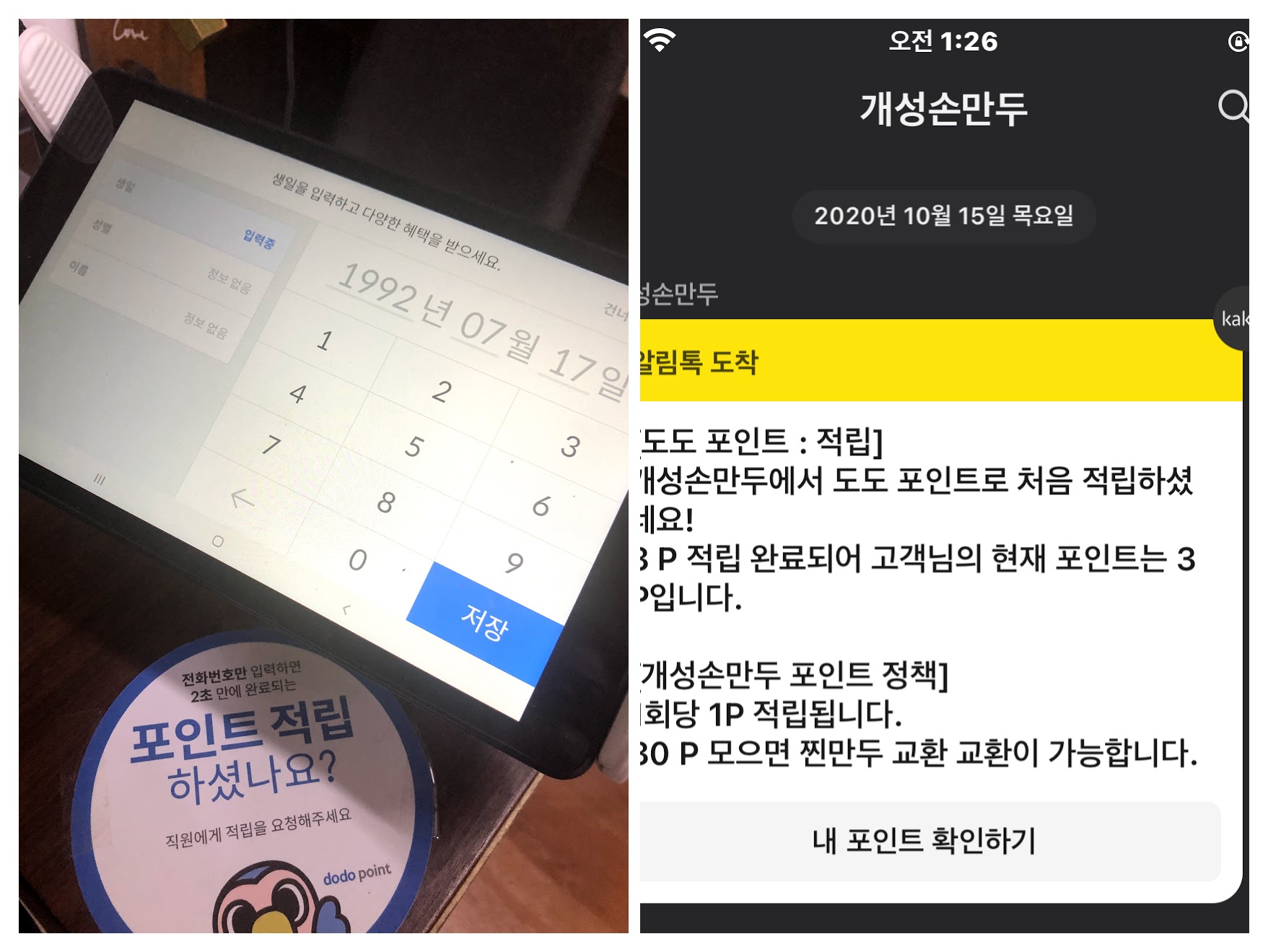 이 화면면은 처음 갔을때 식사 마치고 계산하고 나올 때 포인트 적립하는 것이 있는데요 적립하고 나서 바로 카카오톡으로 문자가 왔는데요 적립하는 부분인데 큰 음식점이 아니면 보통 수기로 하는데 여기서는 바로 적립하고 문자로 바로 받으니깐 기분이 좋았습니다.