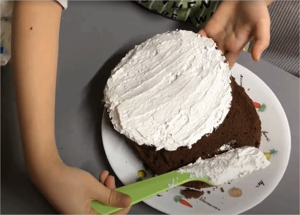 두 번째로는 휘핑크림을 모두 바른 후 완성도를 조금씩 높여서 전체가 하얀 크림으로 모두 덮일 수 있도록 전체를 발라 줍니다. 아이들의 경우 힘이 약해서 휘핑크림 짜는 것이 어려울 수 있습니다. 잘 도와 가면서 케이크 시트 전체를 하얗게 만들고 모양을 예쁘게 만들어 가시면 됩니다.