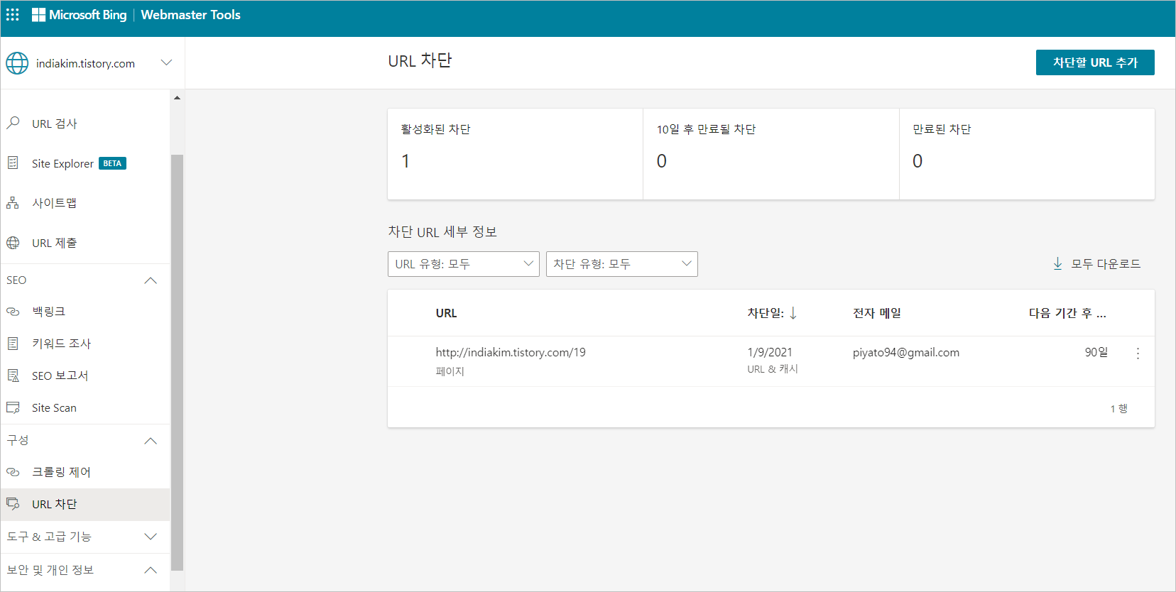 여러 블로그를 등록을 해 놓으면 네이버 처럼 최적화 관리 등의 검색등을 확인이 가능하고 차단할 URL등을 관리가 가능합니다. 완전삭제를 아직 못찾았는데...일단 아래처럼 일정기간동안 차단관리가 가능합니다.