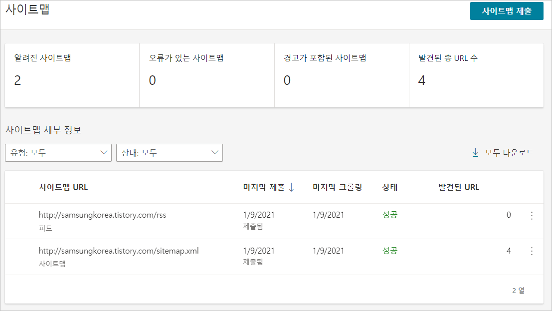 그리고 나서 네이버에서 진행하는 것처럼 사이트맵과 RSS등록 제출을 합니다.