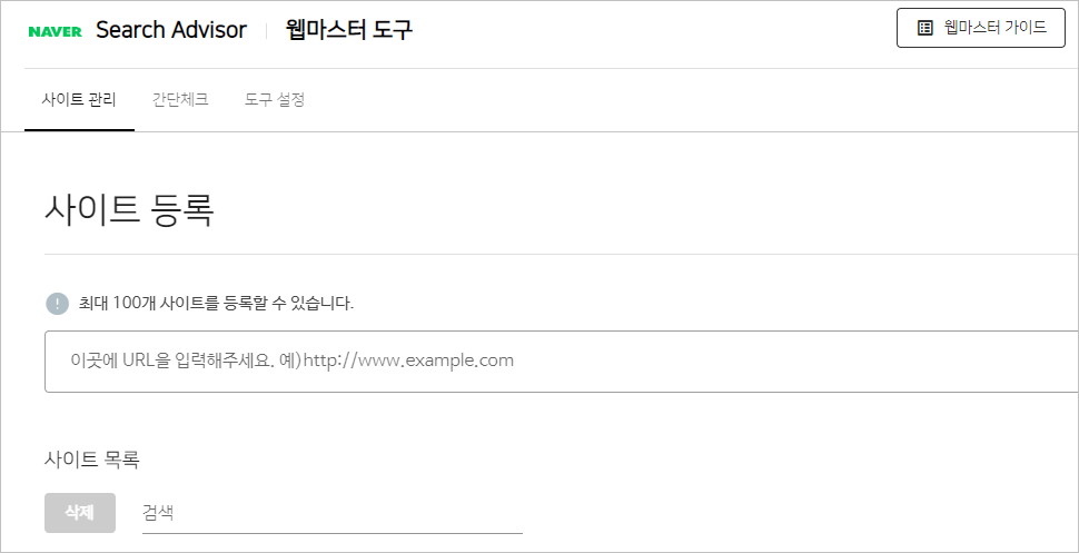 웹마스터 도구 > 사이트 관리 사이트 등록 부분에 본인의 사이트를 Htt://000.tistory.com을 입력을 합니다.